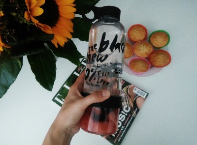 Po dlouhé době jsem si koupila několik časopisů a zrovna jsem měla štěstí na přibalené dárečky. V časopise Elle byla velká láhev se zajímavými potisky. Musela jsem si pohrát s těsněním, ale už mi slouží skvěle. Do spodní části, která obsahuje odšťavňovač, si můžete dát nějaké ovoce či bylinky, aniž by vám to při pití lezlo do pusy.