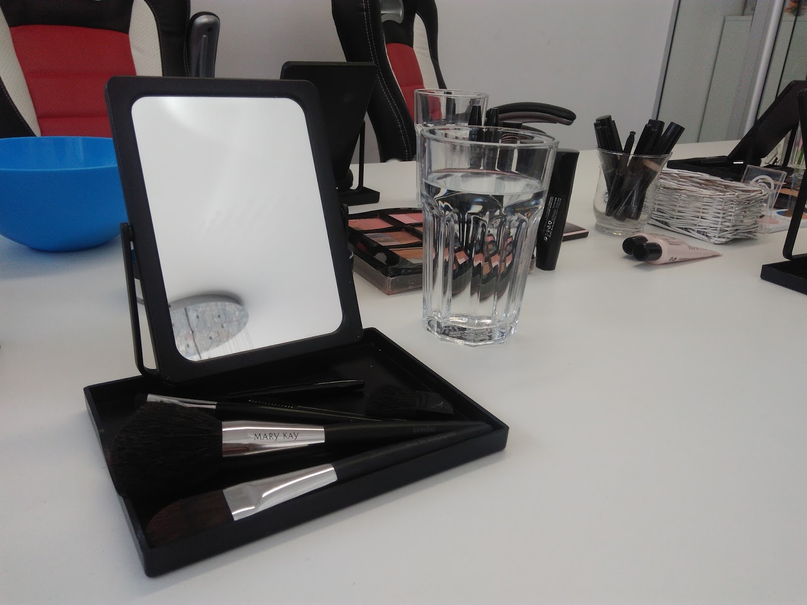 Místo jsme našly celkem snadno, přivítala nás sympatická slečna/paní a zavedla nás do prosklené místnosti plné denního světla, kde už měla připravený stůl se všemi kosmetickými produkty, štětci, zrcátky…