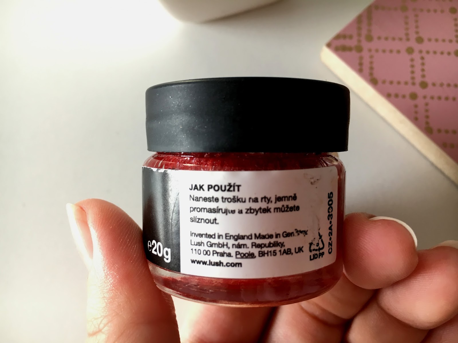 voní hezky sladce – to já ráda! Na stránkách Lushe se píše, že voní jako cherry kola. No, možné to je, já to takhle nepoznám, ale důležité je, že je to hezká vůně. 🙂 Možná proto, aby se scrub mohl ze rtů slízat, není vůbec mazlavý. Ba naopak, je to takový