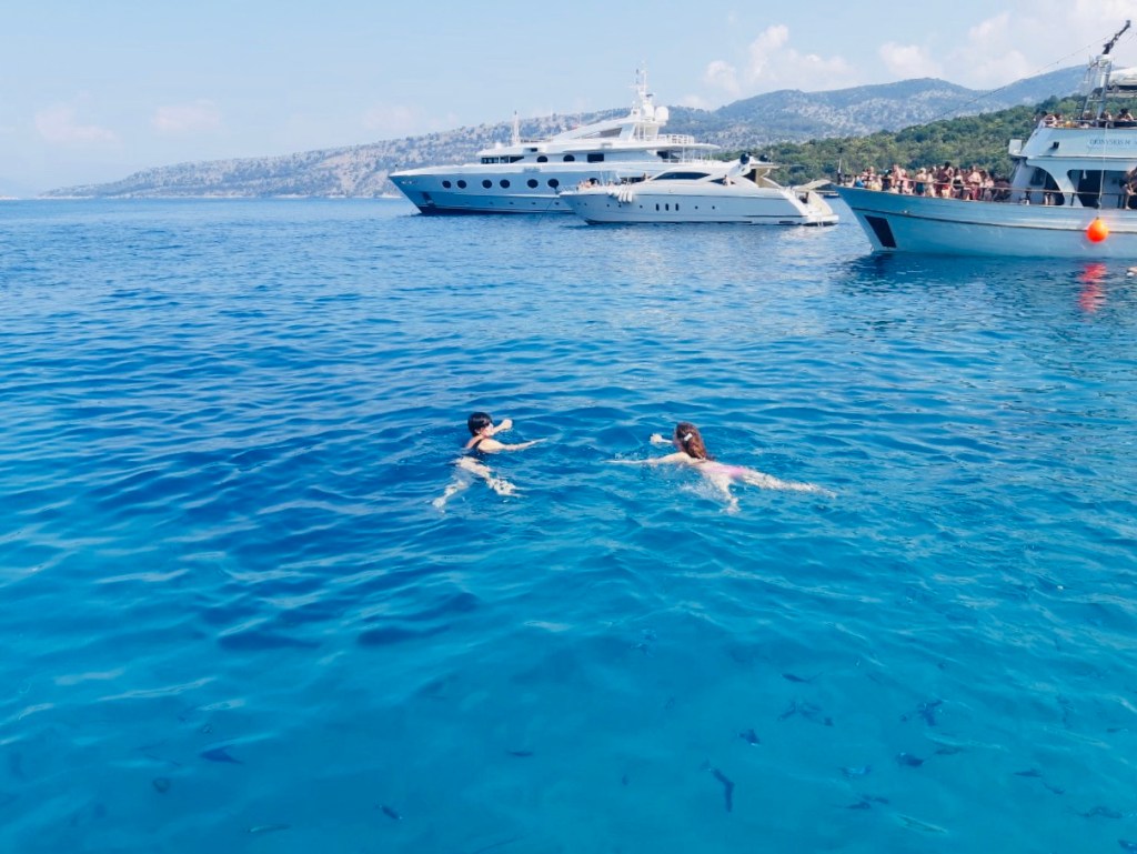Na druhý výlet jsme se vydaly hned následujícího dne. Opět jsme se projely lodí a to pořádně! Jmenovalo se to Blue lagoon. Musely jsme jít na molo asi 10 minut od hotelu, stálo to těch 35 eur na osobu a bylo to naprosto senzační. Na programu byly jeskyně, městečko/vesnička Syvota v Řecku, koupání v „Modré laguně“ a ještě na jedné pláži (Invos nebo tak nějak).